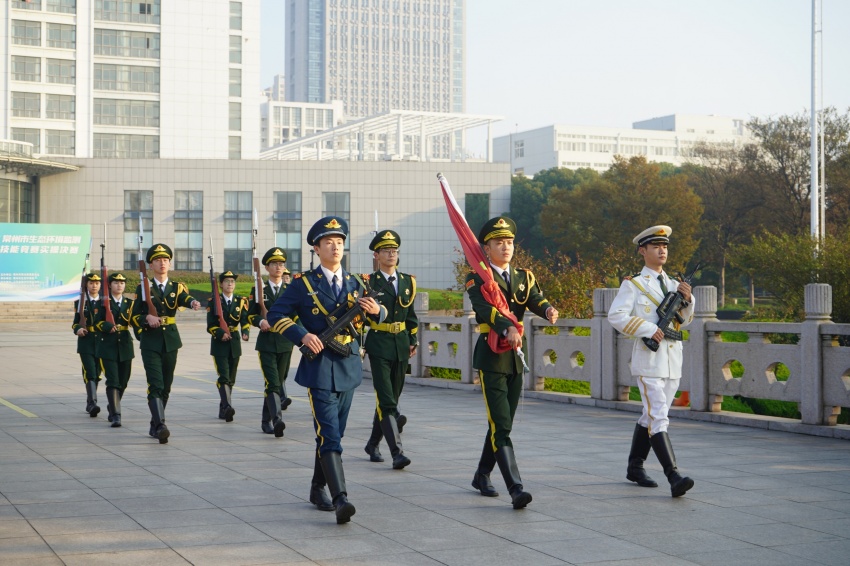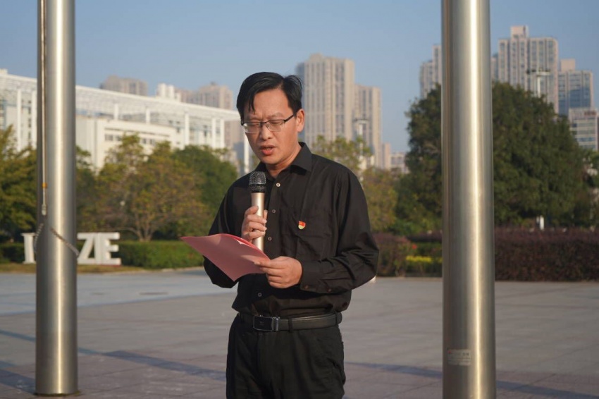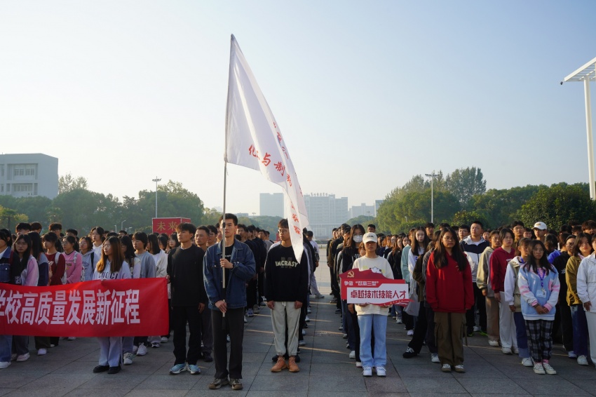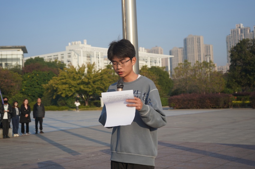 随后,化学工程(本科)2211班赵辉同学代表全体在校生作国旗下发言。他结合自己一年的学习生活,号召全体同学心怀梦想,脚踏实地,以学校“励志·践行”校训为指引,担负时代责任,做一名新时代合格的老员工。